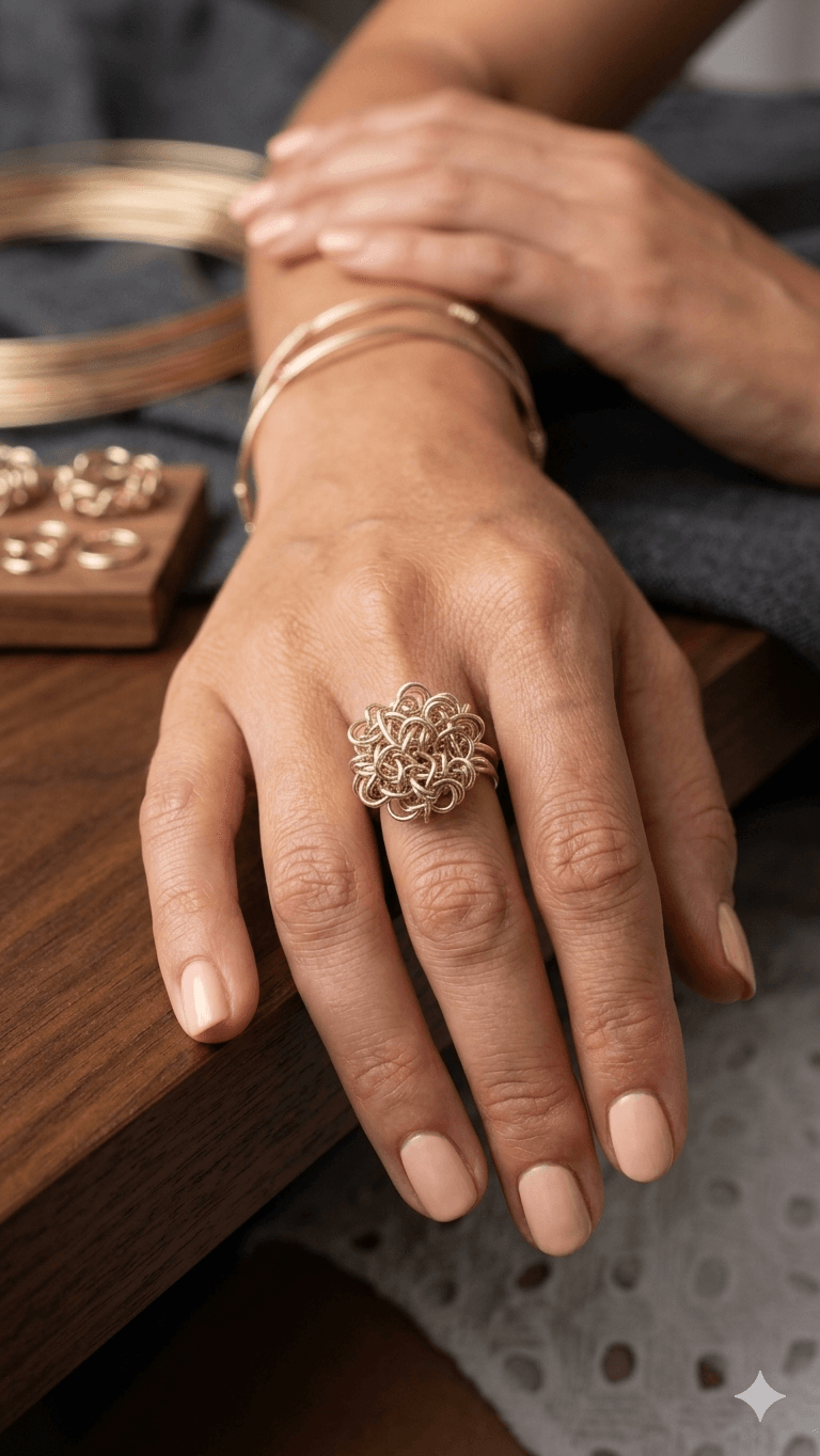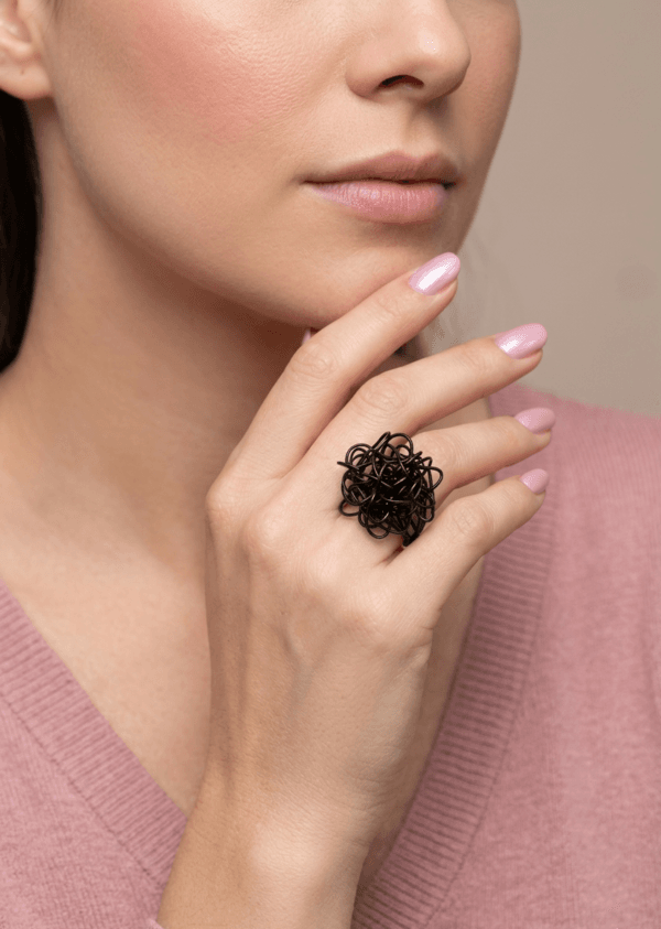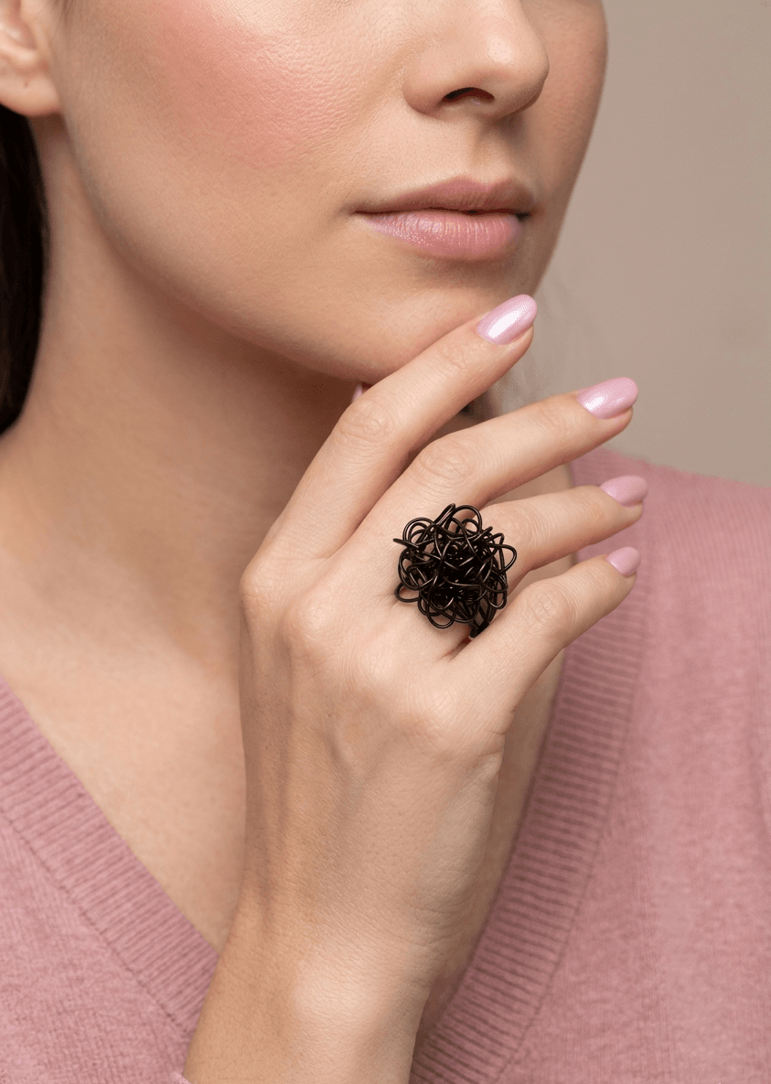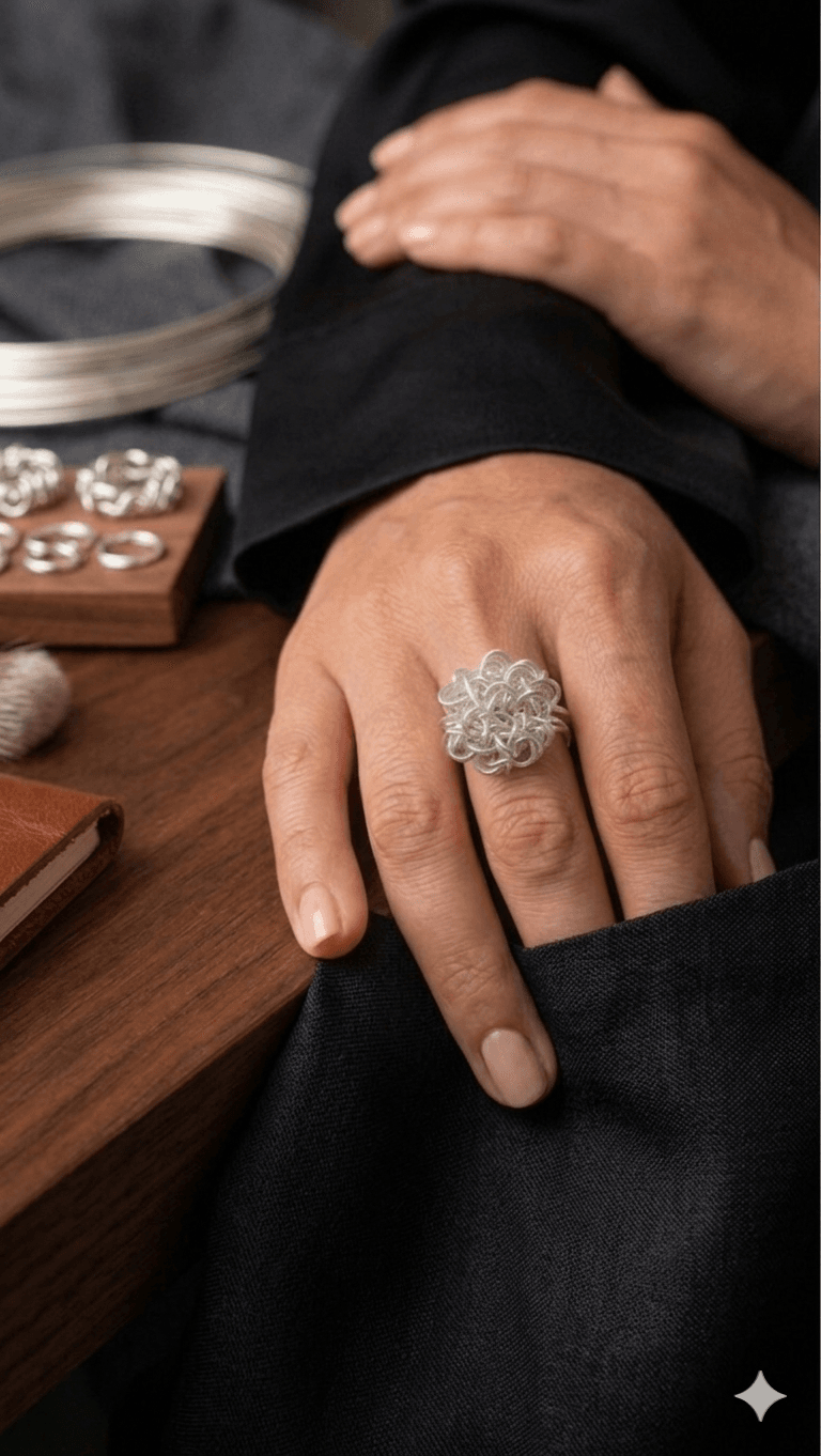 O Anel Rebuliço em Alumínio é uma expressão de design contemporâneo em sua forma mais livre. Feito à mão, cada peça carrega a singularidade do processo artesanal — tornando-o único, assim como quem o usa.